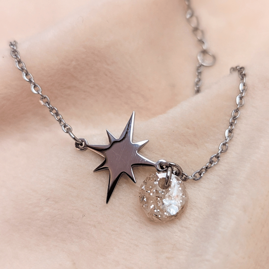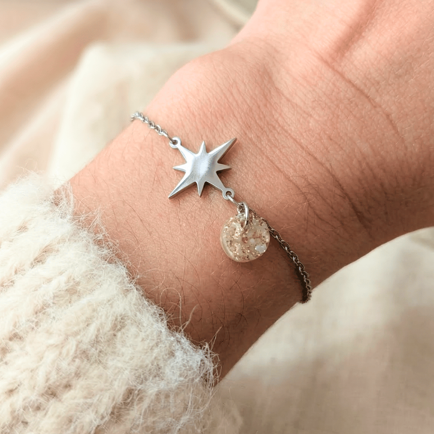 Ce bracelet fin est composé d'une chaîne élégante en acier inoxydable couleur argent, ornée d'une breloque étoile de Polaris, symbole de guide. Le pendentif est une perle unique, que j'ai personnellement façonnée à la main à partir d'authentiques éclats d'ormeau récoltés sur la côte de Kerlouan, en Bretagne. Ses reflets irisés et nacrés rendent chaque pièce unique.