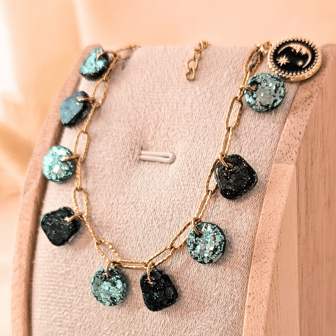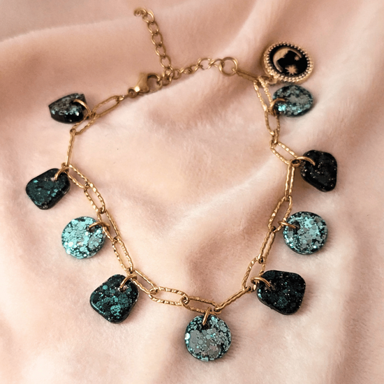 Le bracelet Céleste mêle mystère et lumière dans une version scintillante et élégante. Sa chaîne dorée en acier inoxydable accueille une farandole de pampilles réalisées à la main, alternant paillettes vert d’eau lumineuses et kaki profond.