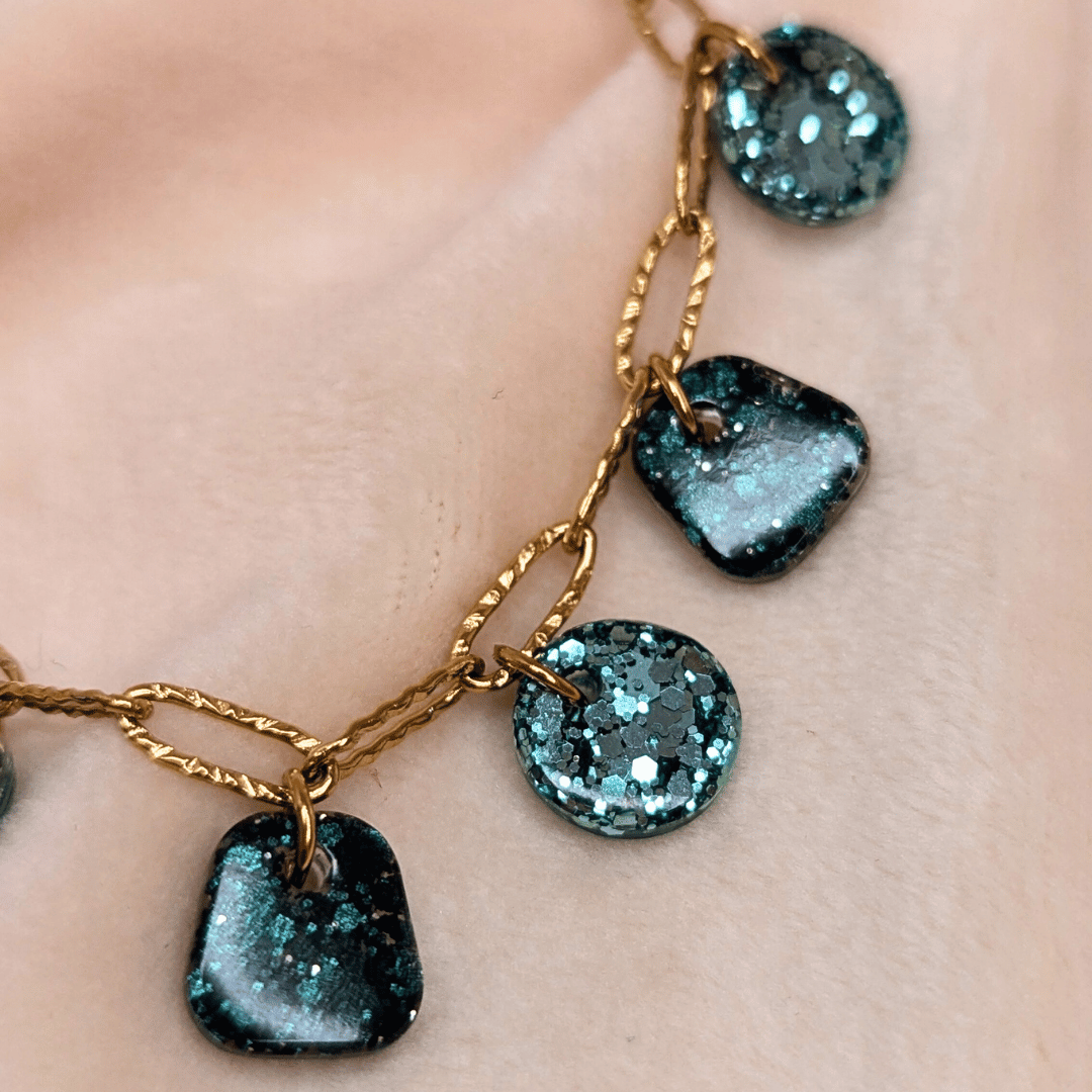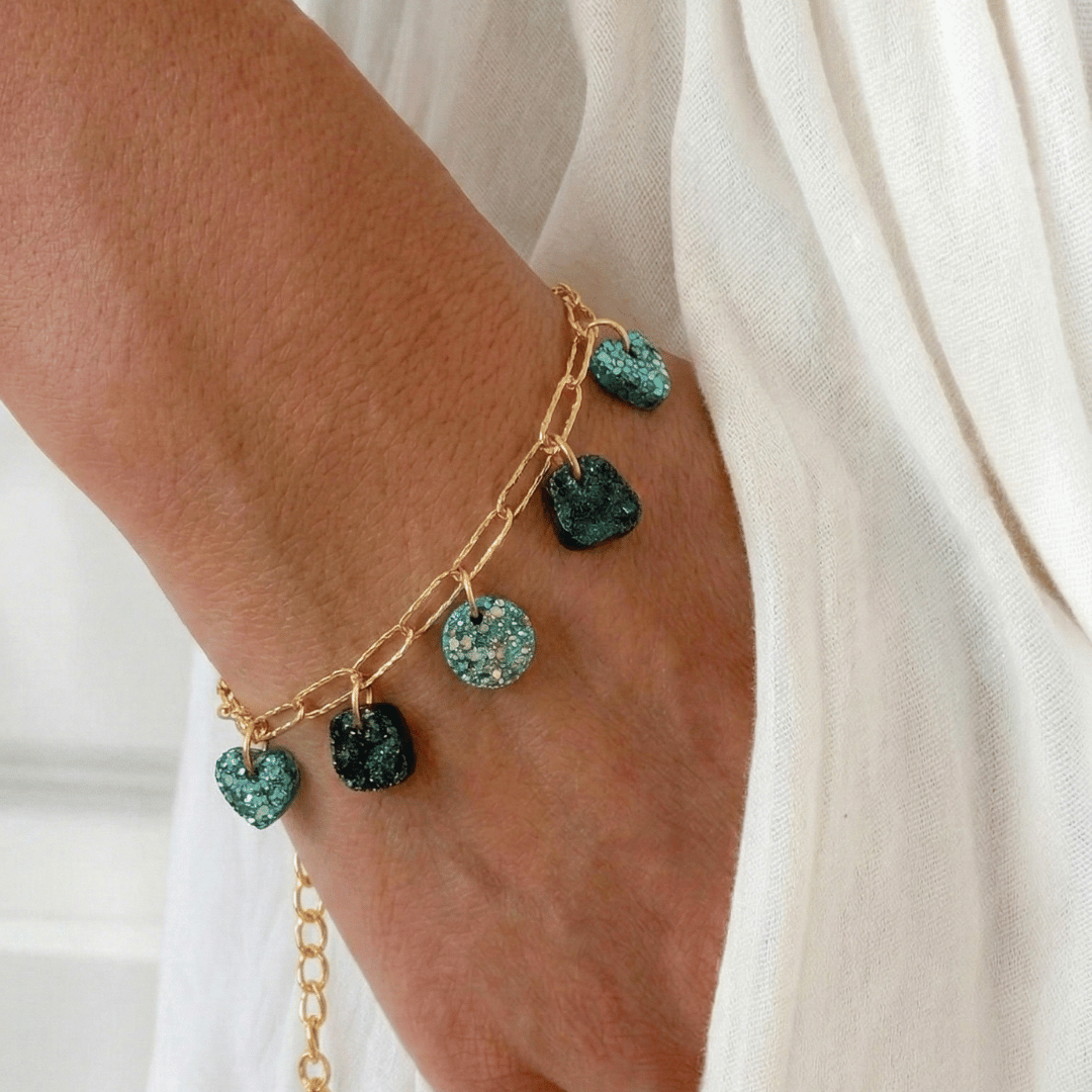 Chaque médaillon est façonné artisanalement en résine, ce qui rend chaque bracelet unique. Les reflets changent selon la lumière, passant d’un vert lagon éclatant à un vert intense.