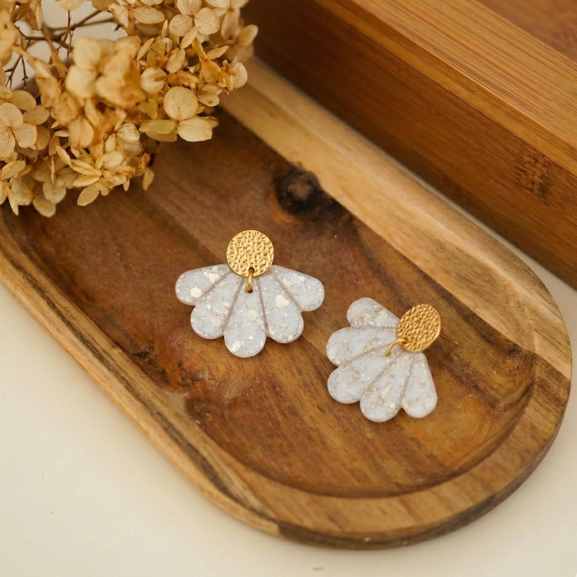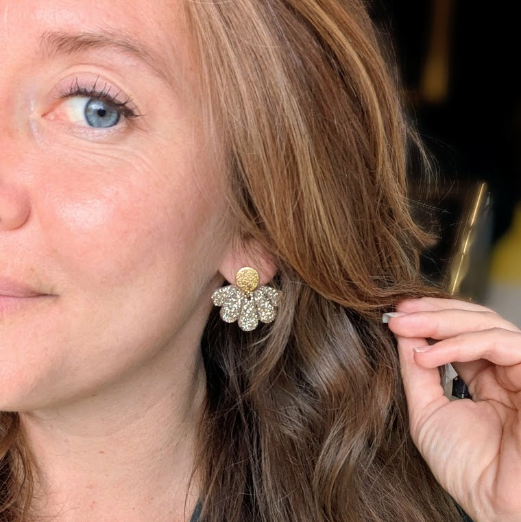 La puce ronde dorée texturée en acier inoxydable accroche subtilement la lumière, tandis que la pièce en résine blanche, parsemée de paillettes éclatantes, capte chaque rayon pour illuminer le visage avec finesse.