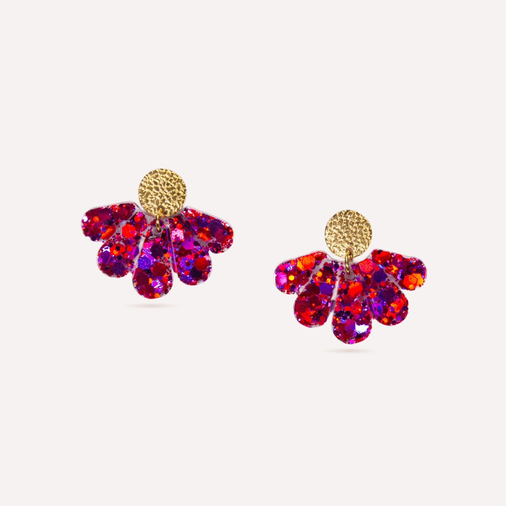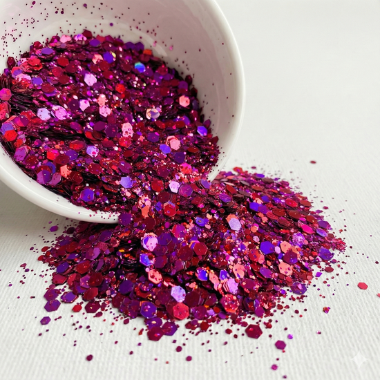 Résine française incrustée de paillettes rouges, fuchsia et reflets violets