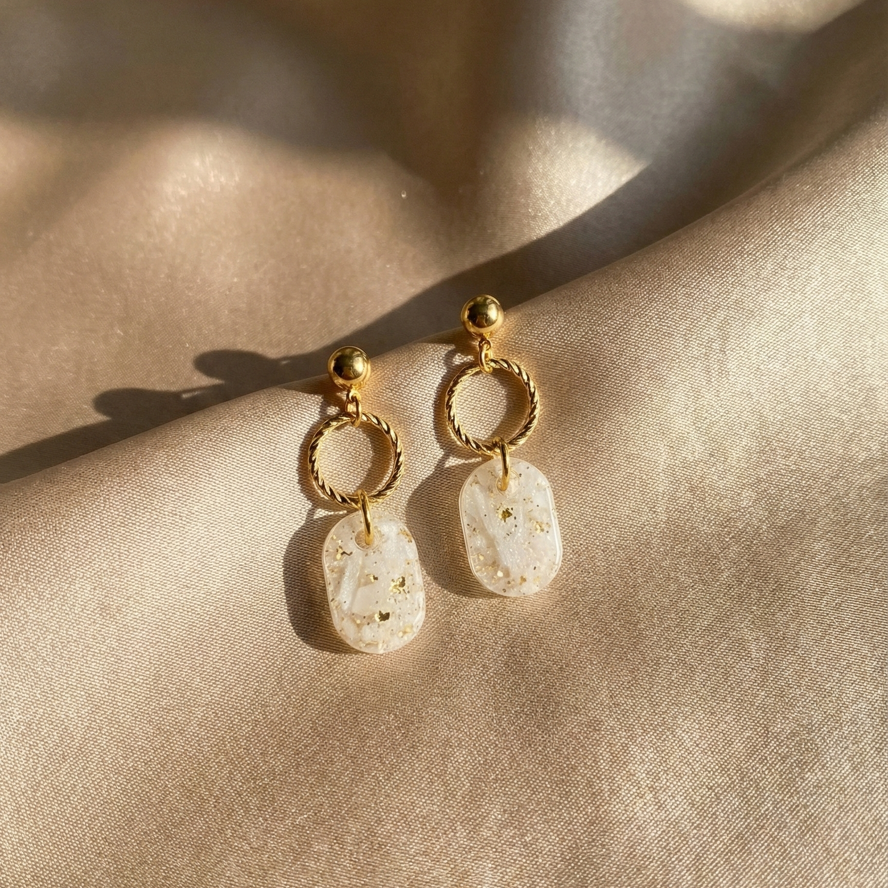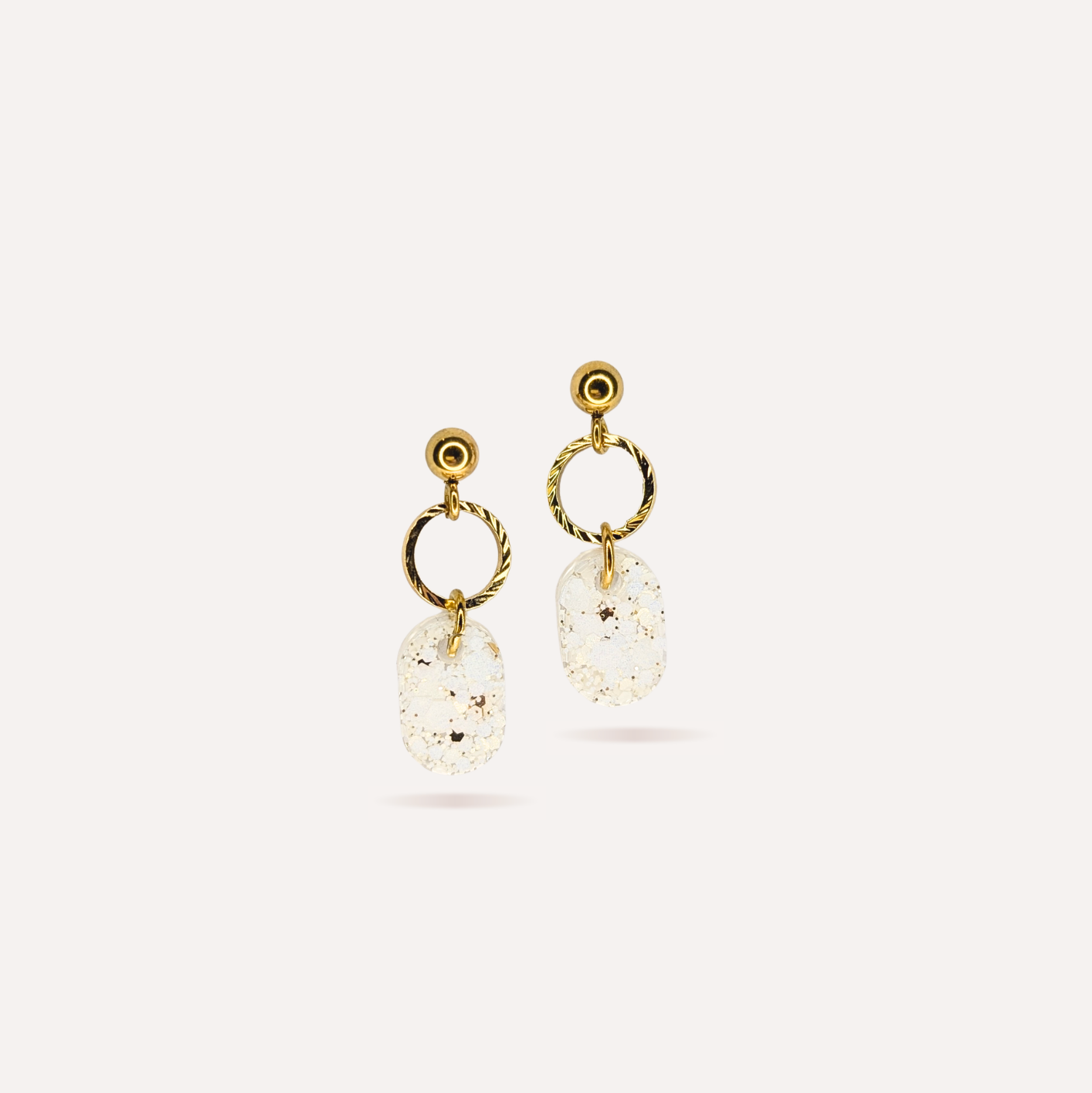 Le pendentif translucide révèle un blanc nacré délicatement parsemé d’éclats dorés, comme une fine neige scintillant au soleil. À chaque mouvement, les reflets changent, doux et raffinés, sans jamais en faire trop.